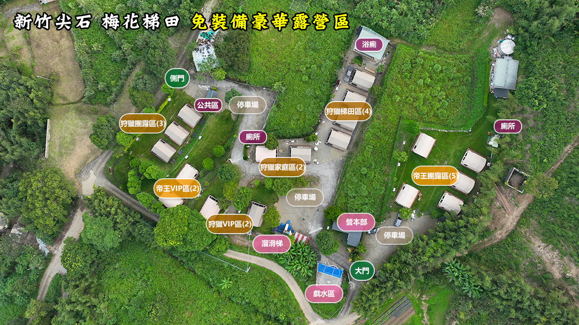 區最下層為狩獵團露區有三帳,依序是帝王VIP區有二帳,再往上是狩獵家庭區二帳包區、狩獵梯田區有四帳、位於遊戲區旁邊的是狩獵VIP區有二帳,最上層