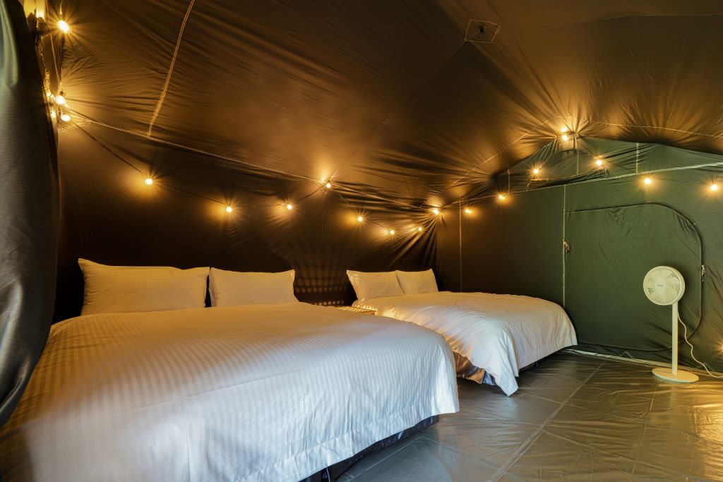 的是具有一桌四椅的客廳炊事區,第二道拉鍊是進入內帳的關卡,進出後請記得拉好拉鍊以免飛入蚊蟲,帳內均設有雙人彈簧床兩張、棉被、電風扇、冷暖氣、床頭